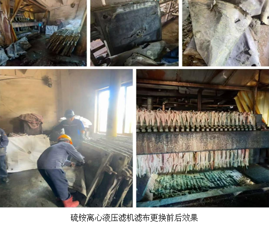 8月12日,威遠(yuǎn)澤天接手焦化脫硫廢液運(yùn)維項(xiàng)目僅兩天,便發(fā)現(xiàn)系統(tǒng)內(nèi)廢液濃度較高,雜質(zhì)含量多。現(xiàn)有壓濾機(jī)的濾布因長期受到物料的沖刷、腐蝕及頻繁的機(jī)械擠壓,已出現(xiàn)不同程度的磨損和堵塞,濾板也發(fā)生變形,導(dǎo)致過濾效果大幅下降,進(jìn)而引發(fā)管道堵塞,使生產(chǎn)無法正常運(yùn)行。為確保焦化脫硫廢液系統(tǒng)的高效穩(wěn)定運(yùn)行,威遠(yuǎn)澤天生產(chǎn)部迅速對焦化硫酸銨離心液壓濾機(jī)的濾布進(jìn)行了全面更換。